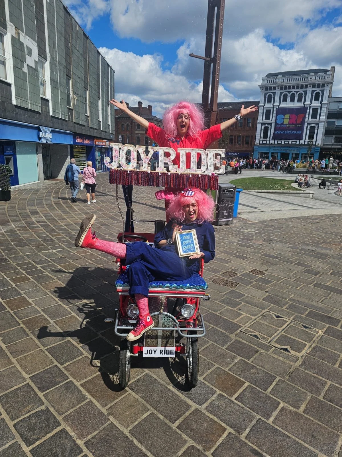 Equal parts spectacle, pop-up ride, and roaming conversation-mobile, Joyride brings people together through laughter, curiosity, and colourful chaos. Highly visual, welcoming, and delightfully off-beat, it creates instant atmosphere and invites audiences of all ages to take part.
